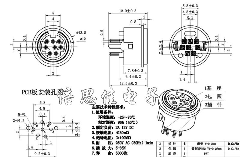 S terminal mini PS2 socket DIN seat 8P eight-core all-plastic round female seat 180 degrees
