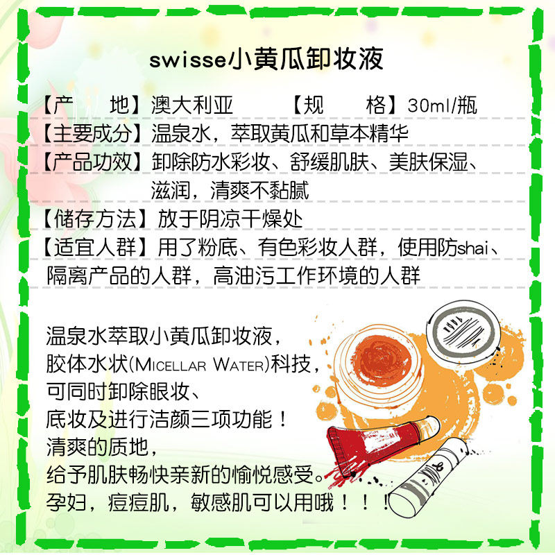 Australia Swisse Hot Spring Water Extract Cucumber Make-up Remover 300ML Face cleansing make-up remover available for pregnant women