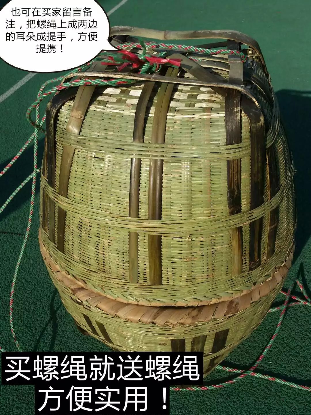 A pair of green ropes 10 meters long, a single basket with a diameter of 54 and a height of 35 centimeters, a bamboo pole and a pair of baskets