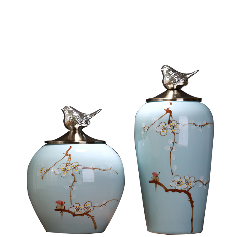 New Chinese golden bird Classical ceramic storage can decoration creative ornaments Plum bird print silver-plated vase