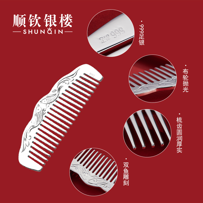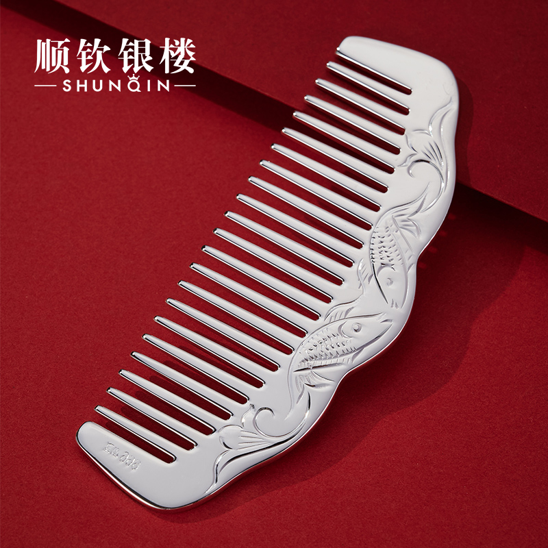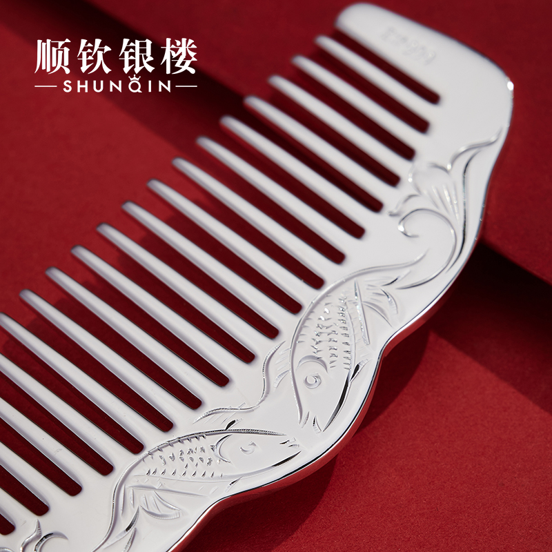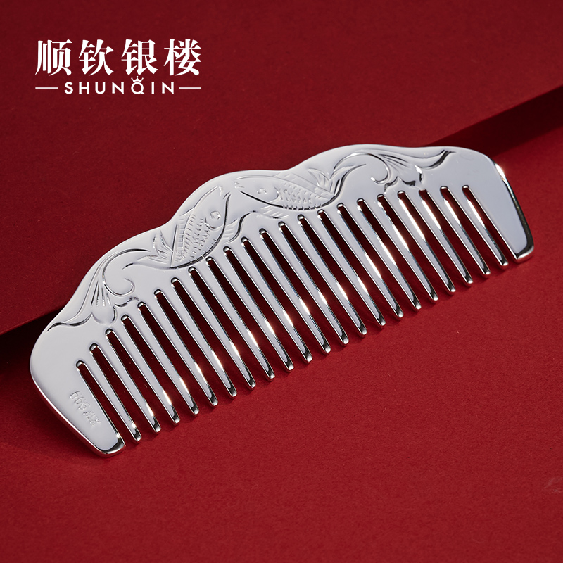 The Shunqin silver building S999 pure silver national wind year after year with fish without handle comb glossy foot silver comb Mother's Day gift