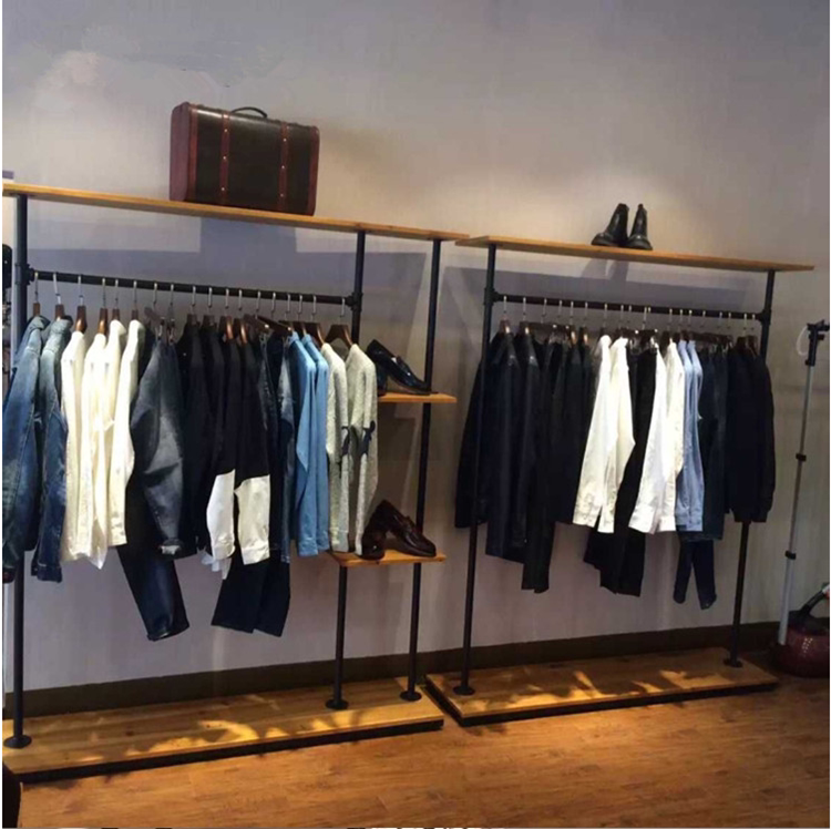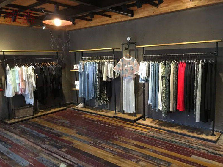 Retro solid wood wrought iron clothing display rack front side hanging men's and women's clothing hanger floor-to-ceiling clothing store shelf