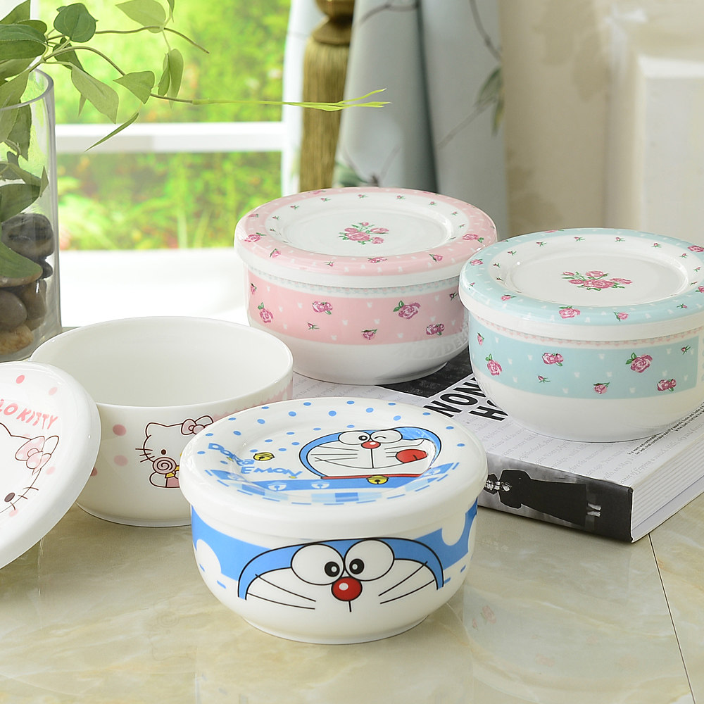 Ceramic Bowl Cartoon Cutlery with porcelain cover Microwave Lunch Box Rice Bowl Rice Water Stop Saucepan Steamed Egg Sweet Soup Bowl