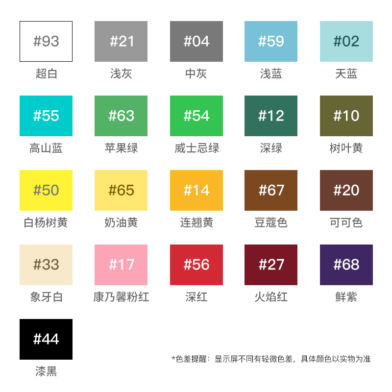 #44 pitch black #21 light gray #04 medium gray #33 Ivory White #93 Super White #65 cream yellow #12 dark green #59 light blue #27 flame red #56