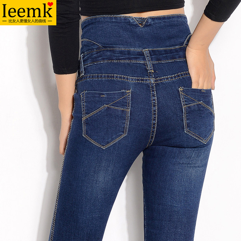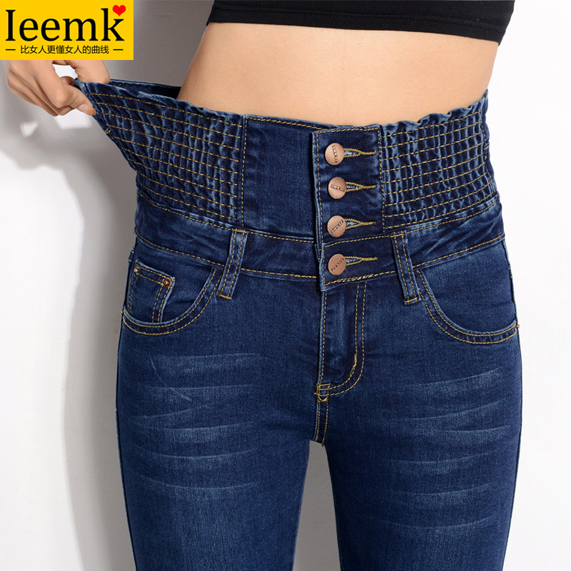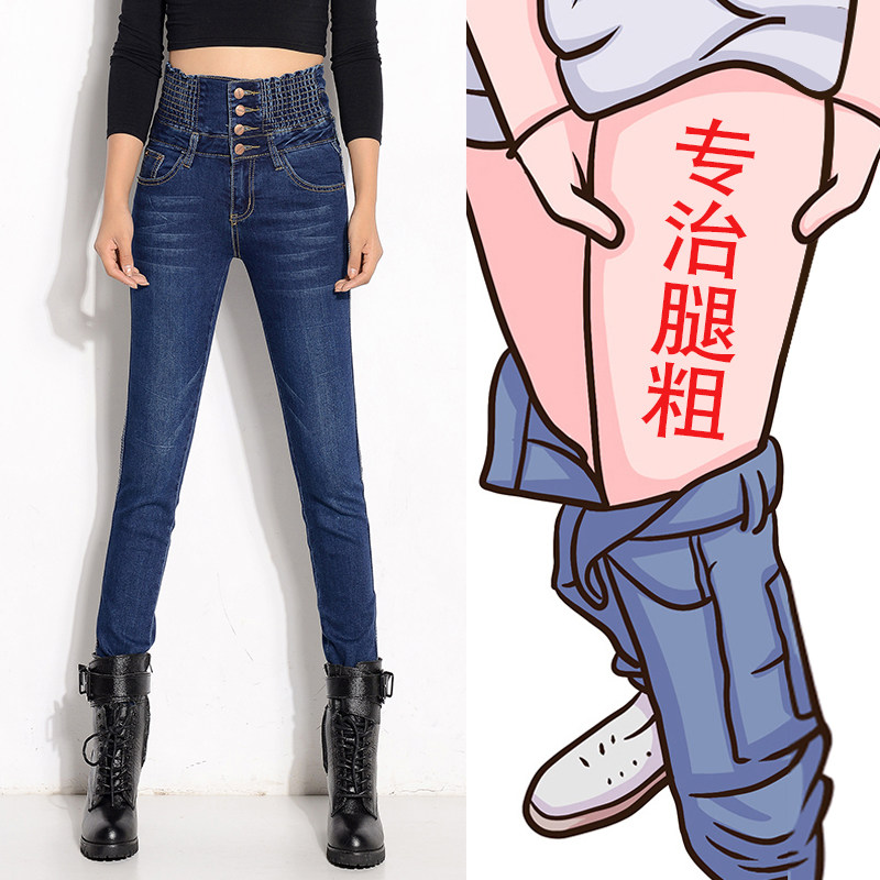 High waist belly jeans women's pants large size small feet show thin fat mm200 pounds plus fat plus velvet thick winter
