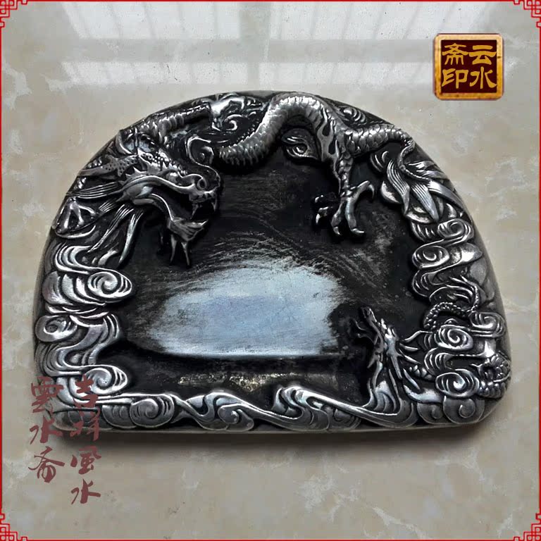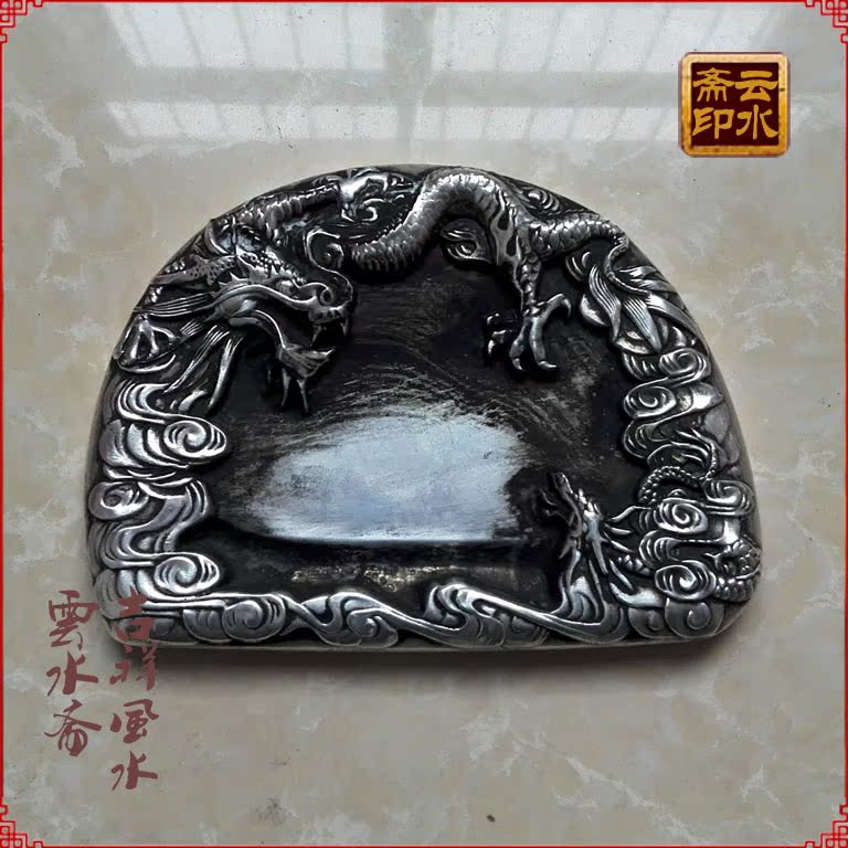 Ancient Play Antique Vintage Room Four Precious Stone Ink Stone Slab Imitation Ancient Pure Bronze Solid White Bronze Imitation Ancient Ink Stone Bench Double Dragon