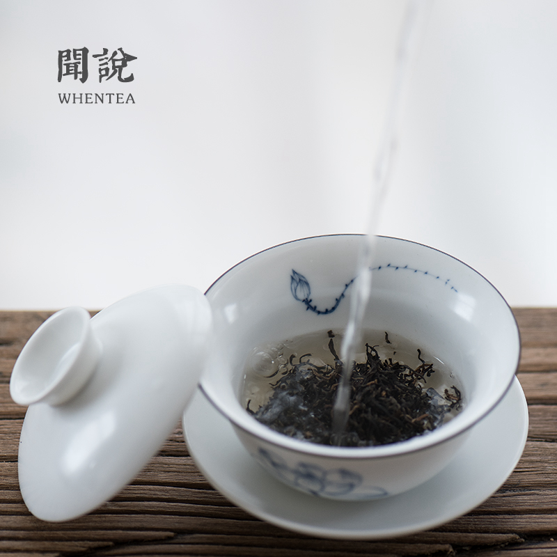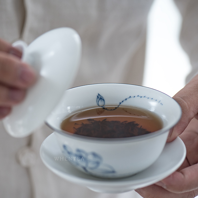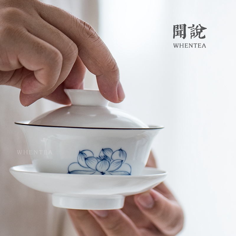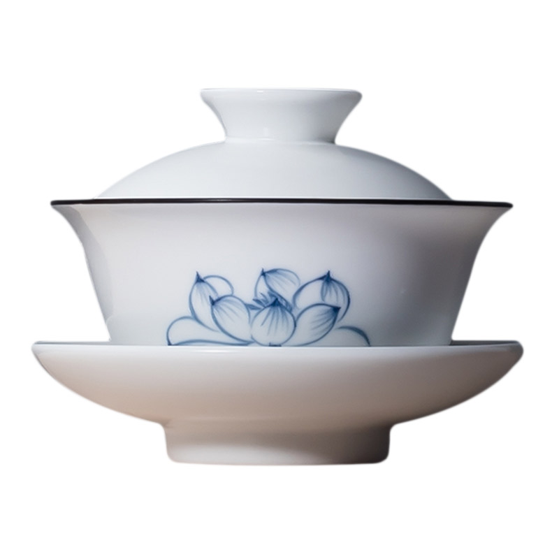 Pure hand-painted lotus Gaiwan Jingdezhen Sansai handmade tea bowl underglaze color matte fat white porcelain thin tire