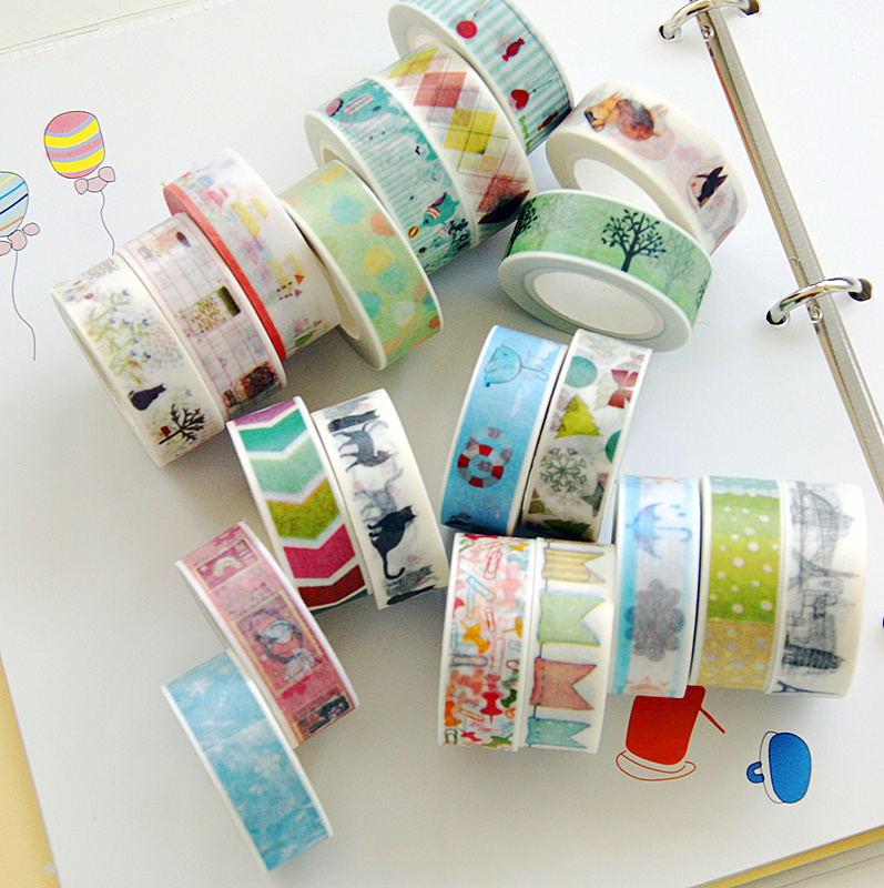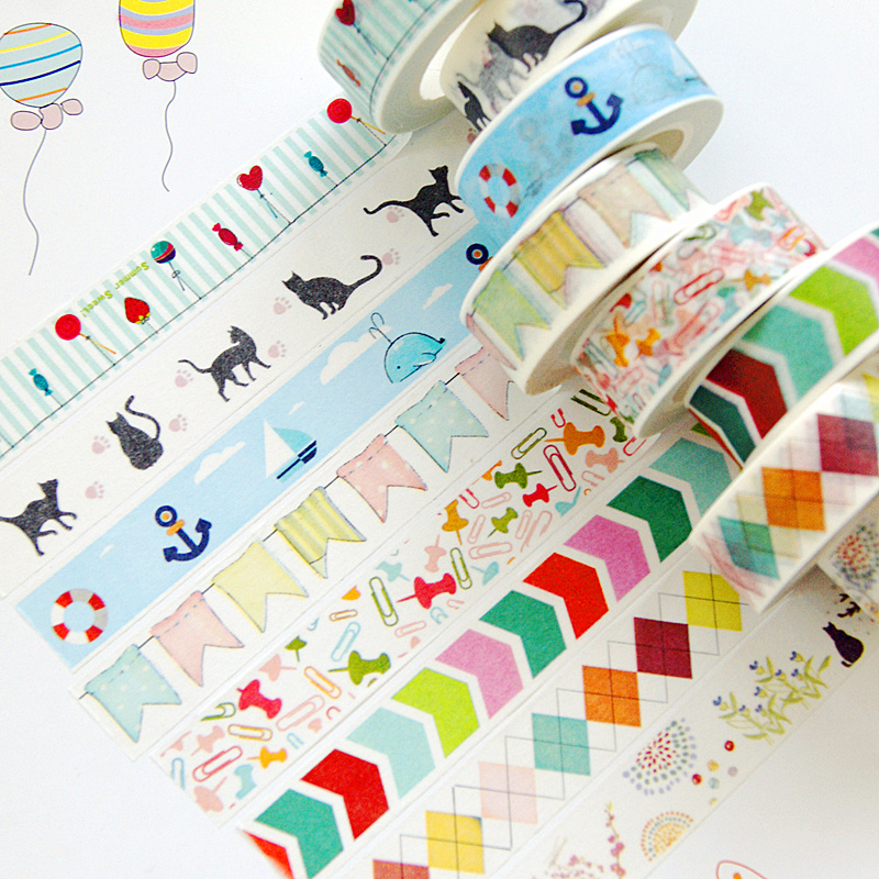 Width 1.5cm length 10 meters Traceless hand torn sun wind washi paper tape Cartoon life label small sticker Cat diary hand account decoration photo album diy sticker Color pattern single-sided tape