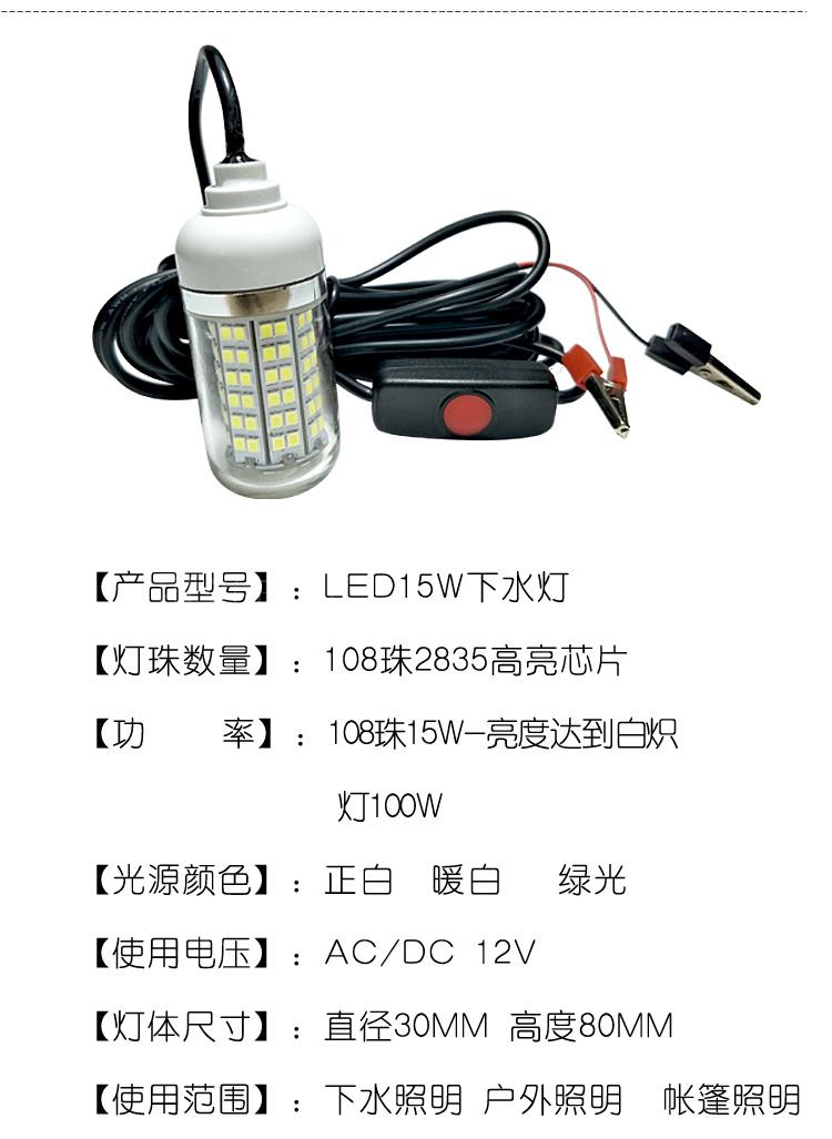 Launching lamp 15W green light (5 meter wire with switch) underwater lamp 15W white light (5-meter wire with switch) underwater lamp 15W yellow light (5-meter wire with switch) underwater lamp 15W blue light (5 meter wire