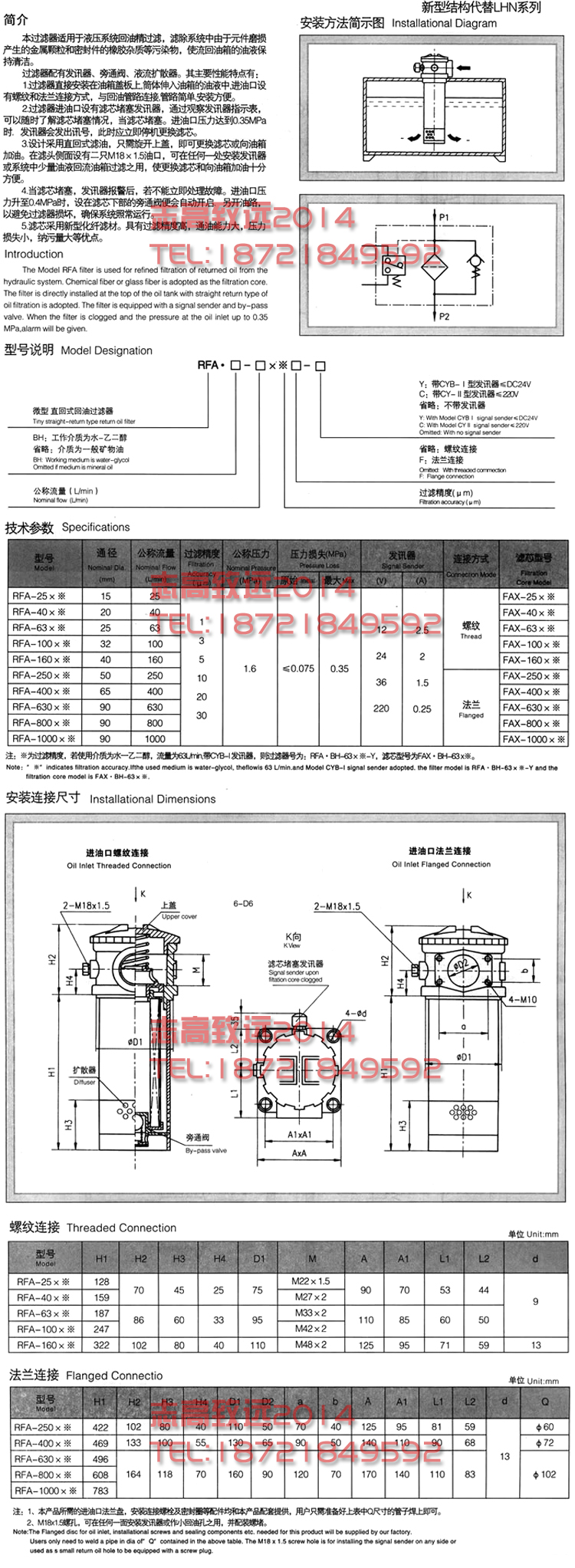 Return filter RFA-25*10 20 Return filter RFA-40*10 20 Return filter RFA-63*10 20 Return filter RFA-