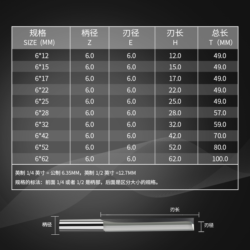 Imported straight groove milling cutter 6 * 12 * 50 Total length Import straight groove milling cutter 6 * 15 * 50 Total length Import straight groove milling cutter 6 * 17 * 50 Total length Import straight groove milling cutter 6 * 20 * 50 Total length