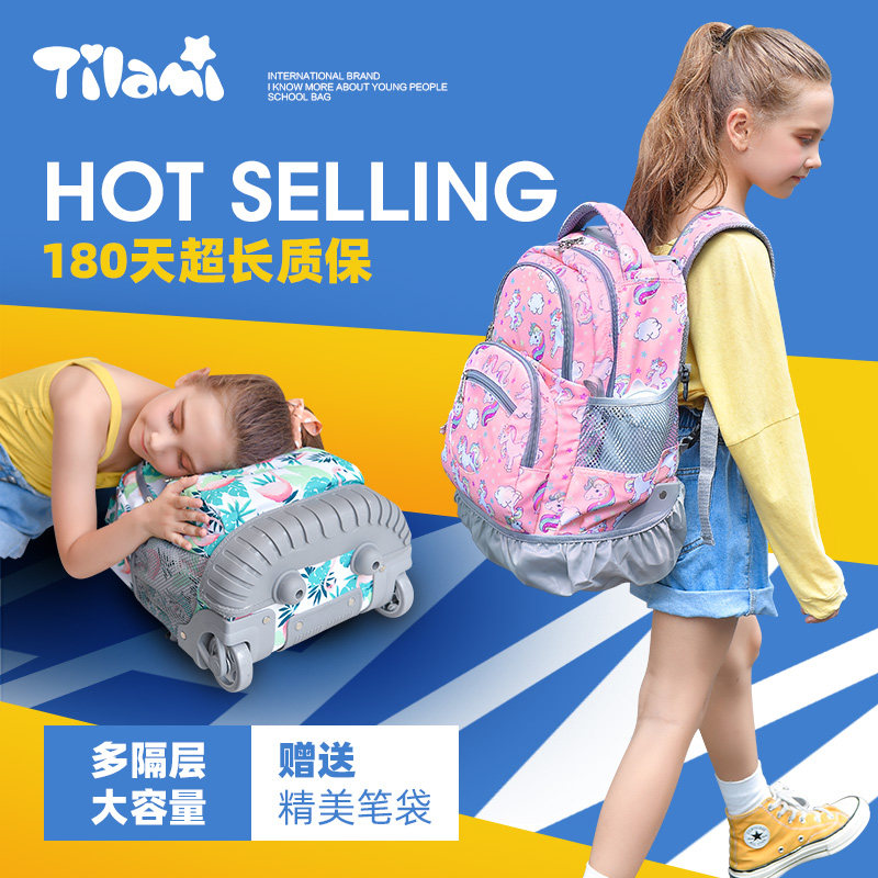American TILAMI original primary school student pull rod school bag 1-3 grade boys and girls reduce stress and reduce stress large capacity ridge guard