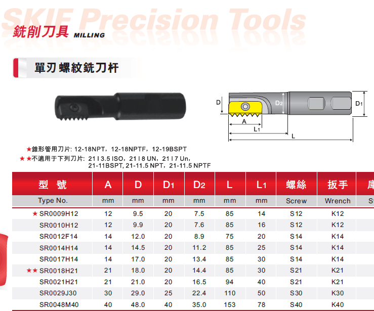 Internal thread milling cutter rod internal cooling metric thread milling cutter M12 comb milling cutter SR0021H21 single-edged indexable