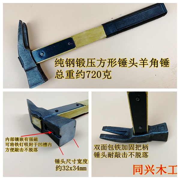Square top hammer Woodworking sheep horn hammer Iron reinforced handle Square top hammer nail hammer hammer hammer tool hammer nail hammer shell plate