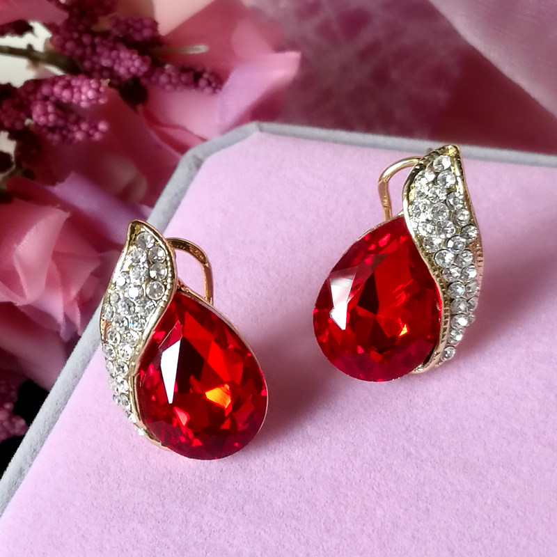 European and American atmospheric bride earrings ruby water drop anti-allergic earrings black gemstones without pierced ear clips wedding ear jewelry