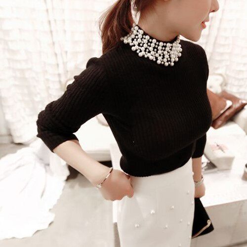 South Korea imported spot light luxury elegant romantic pearl retro high collar beaded slim fashion base thin sweater