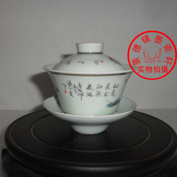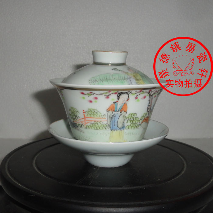 Jingdezhen Cultural Revolution Porcelain Factory goods ceramic pastel hand-painted maid figure cover bowl Cover cup Teacup bag old fidelity