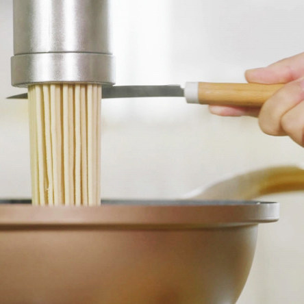 A noodle maker with a face to face with a noodles