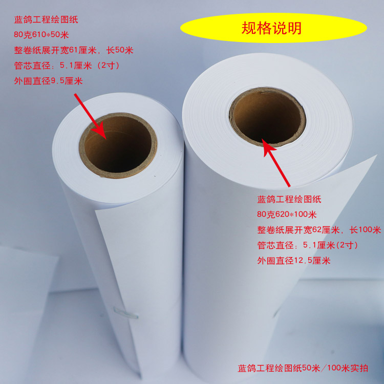 The following specifications are all two inch tube core white paper 80 gr A3 310mm * 50 m One case 10 80 gr 80 gr A2 440mm * 100 m One box 6 volumes 80