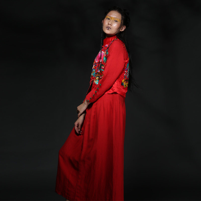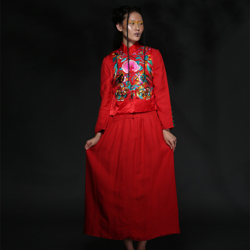 Cloud decoration totem original hand-made hand-embroidered women's two-piece set autumn and winter hand-embroidered old embroidered dress red