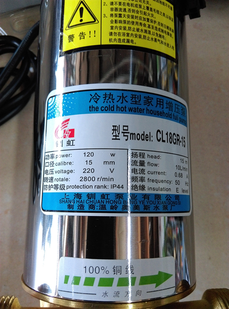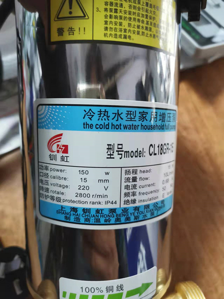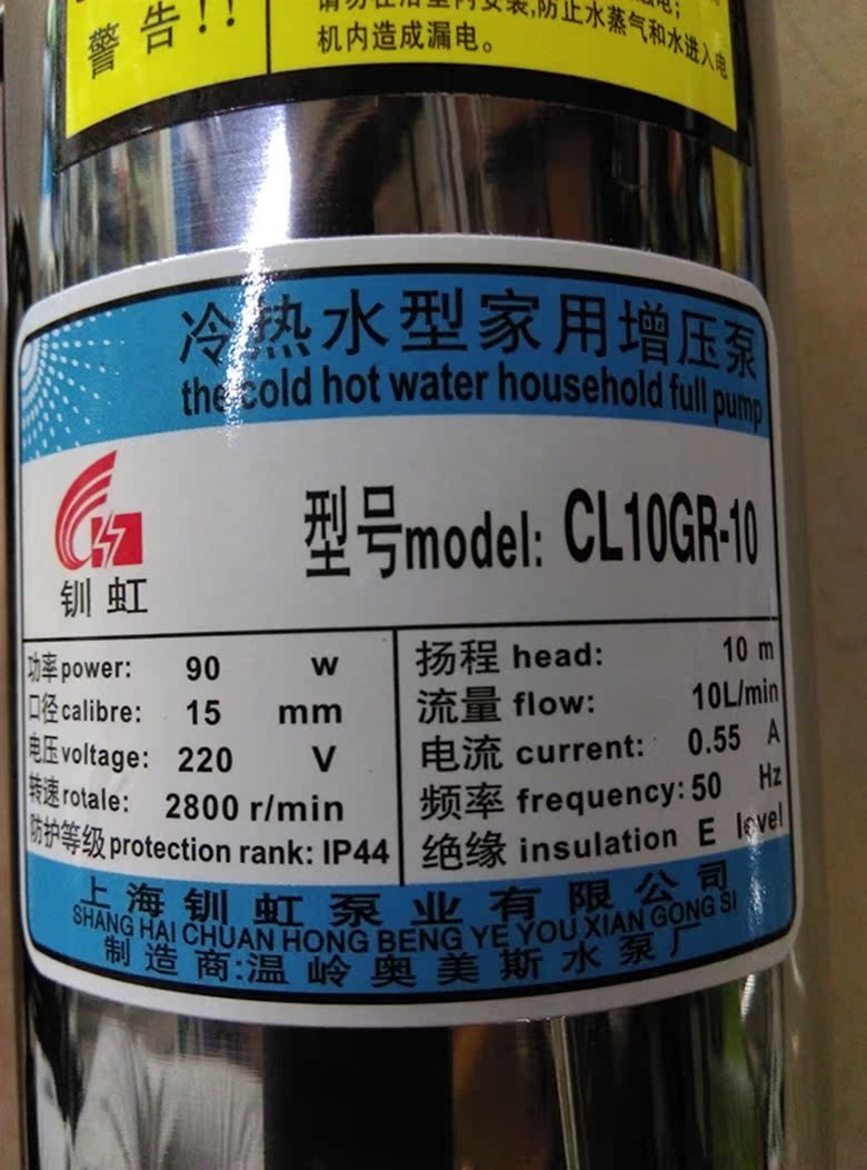 Shanghai Chuanhong booster pump fully automatic stainless steel shell water heater booster household pump type CL10GR-10 90W
