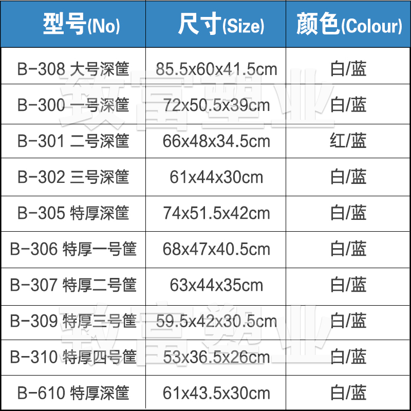 B-308 white (polyethylene) B-308 blue (polyethylene) B-300 blue (polypropylene) B-300 red (polypropylene) B-301 blue (polypropylene) B-302 blue