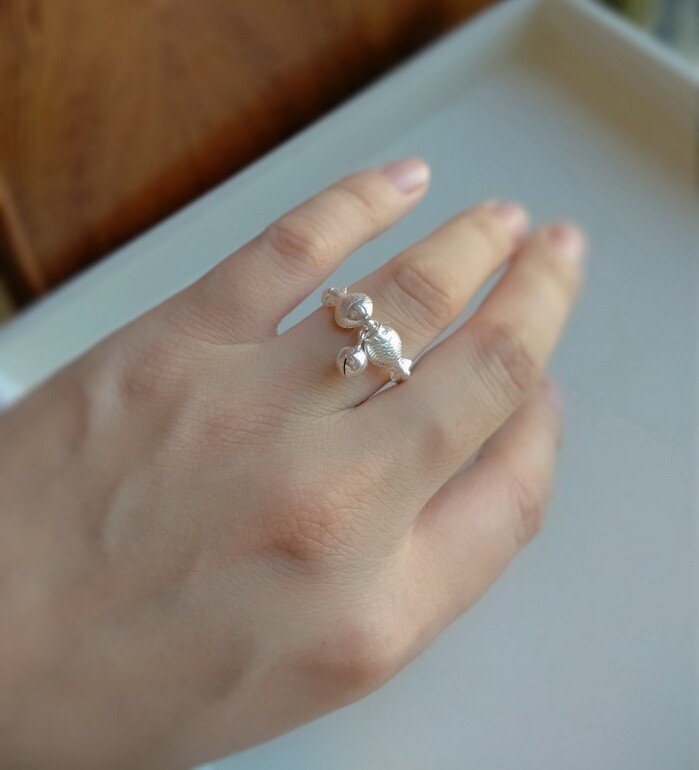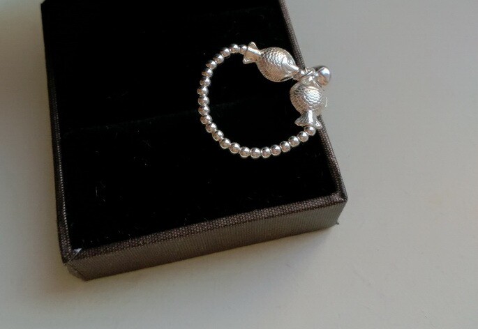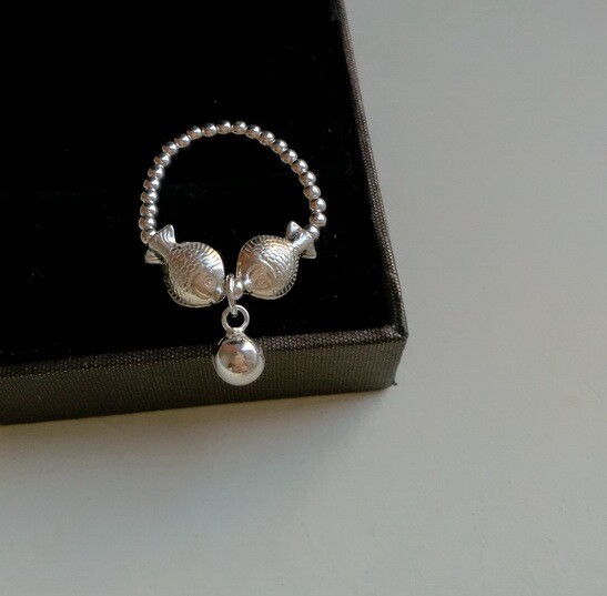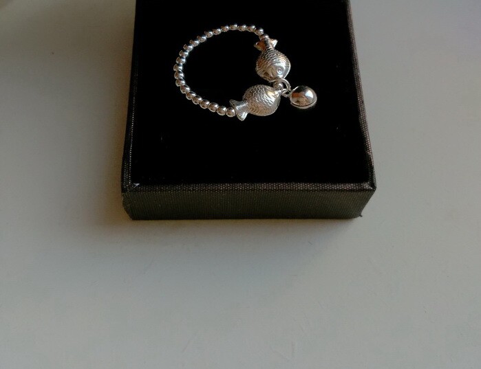 Original transfer beads S925 pure silver round pearl ring bell small fish double fish kissing elastic ring tail ring girl