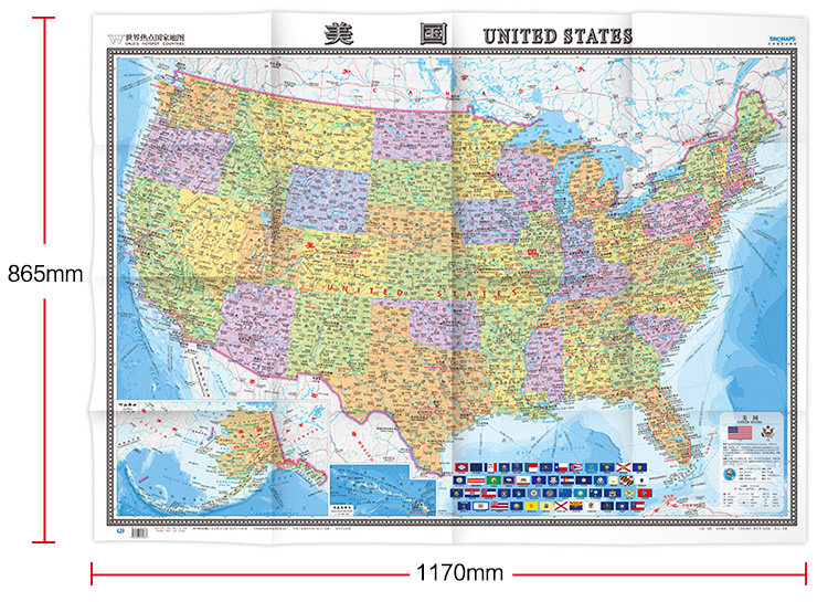 The 2020 new edition of the U.S. map sticker 1.17 meters X 0.86 meters in Chinese and English is marked in large characters with the university airport highway traffic tourist attractions folded and used