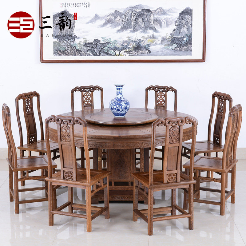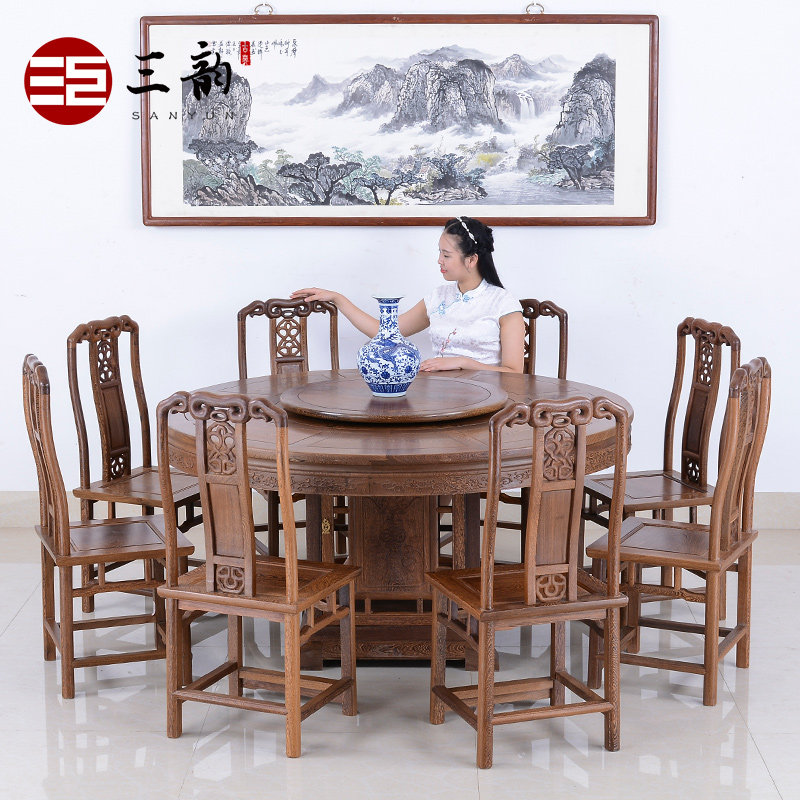 Mahogany furniture Chicken wing wood dining table and chair combination Chinese antique Ming and Qing dining table Round dining table Solid wood dining table