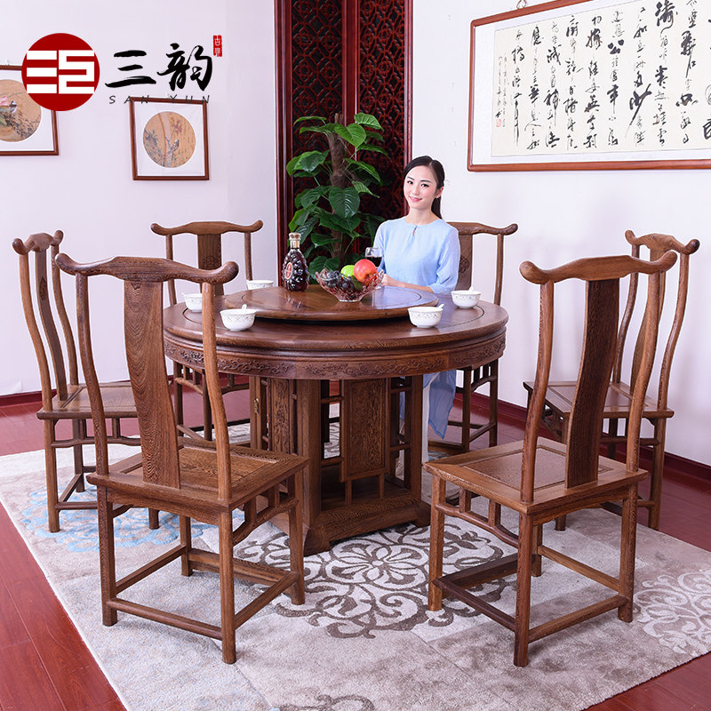Mahogany furniture Wenge dining table and chair combination Round dining table Chinese antique Ming and Qing dining table Solid wood dining table
