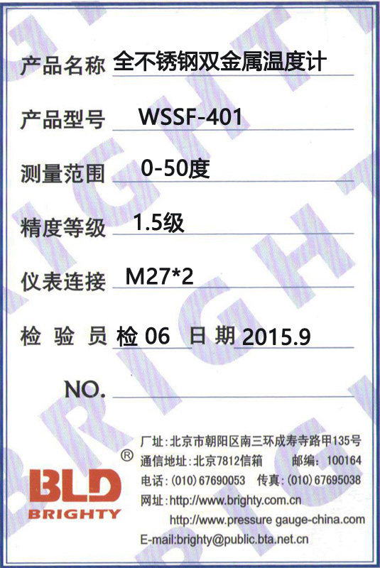 Beijing Brady stainless steel bimetal thermometer WSSF-403 full steel anti-corrosive temperature gauge WSSF-401