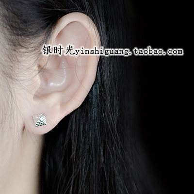 Silver Time S925 Sterling Silver Stud Earrings Three-dimensional Small Pyramid Earrings Creative Personality Fashion Square Earrings for Men and Women