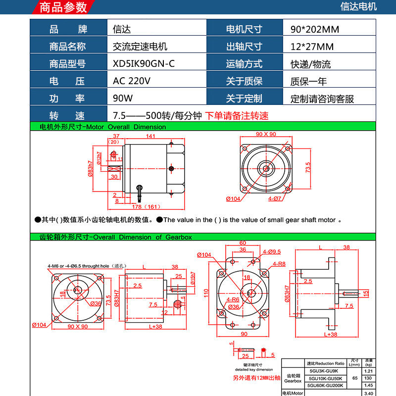 90W AC gear motor 220V positive and negative low speed motor Slow high torque induction motor