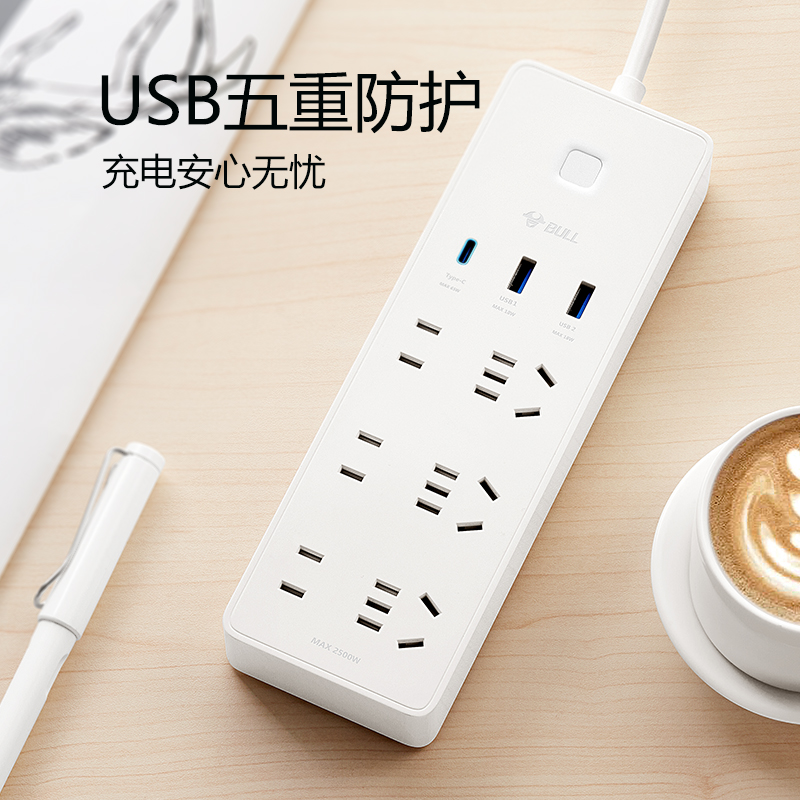 Bull socket USB multi-hole smart 65W fast charging plug-in plug board home multi-function towing board with cable