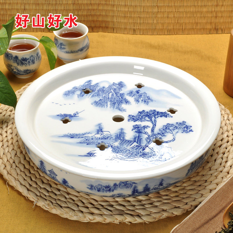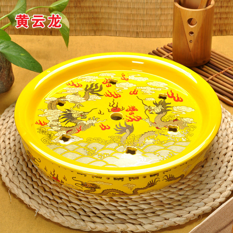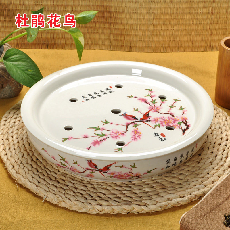 Green flower porcelain ceramic tea tray tea boat round tea table tea seat Gongfu tea plate tea tray water storage tea sea double layer