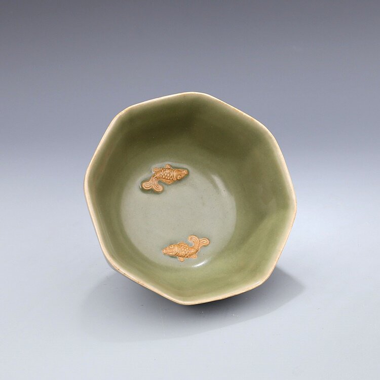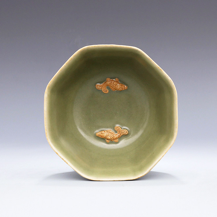 Song Longquan Kiln Mezi Green Engraving Lotus Double Fisher Grain Anise Bowl Antique Porcelain Ancient Play Ancient Porcelain Ware Collection