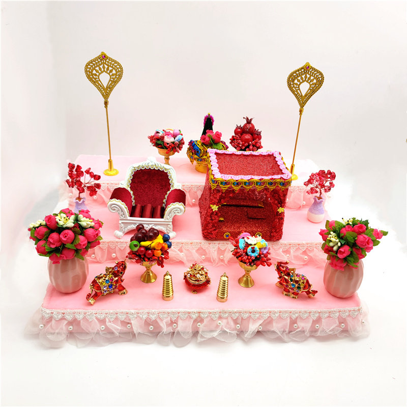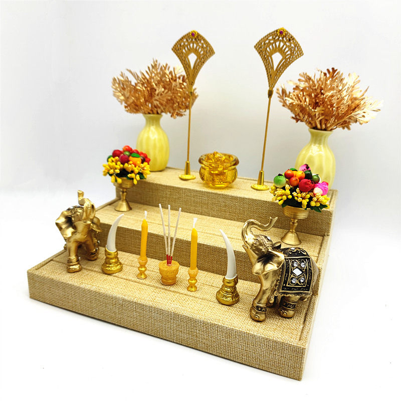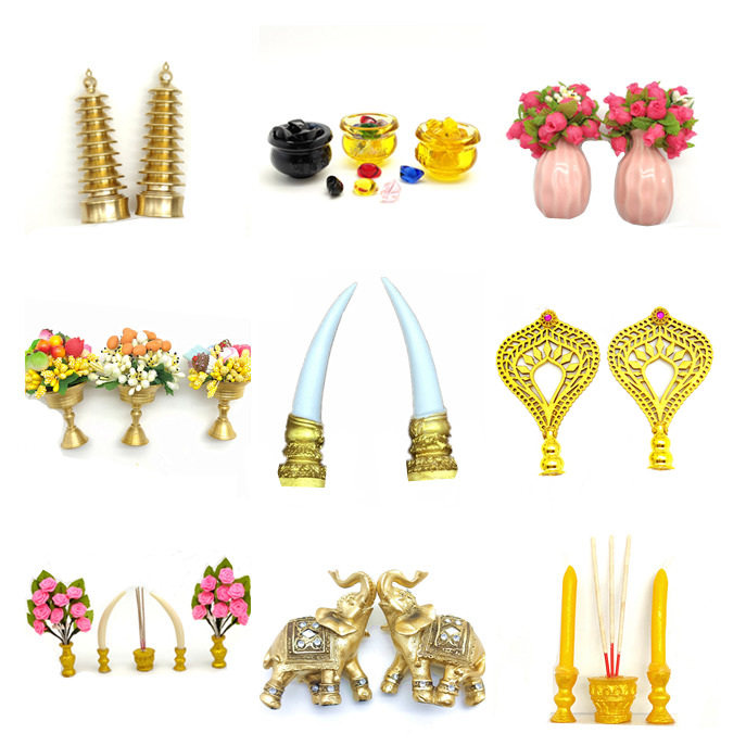 1 pair of small white teeth 1 pair of transparent vase 1 metal polyester basin 1 pair of small bronze tower Thai mixed set mini gold candle 5 piece set 1 pair of resin gold elephants 1 pair of resin gold elephants
