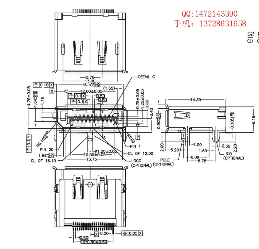 DisplayPort HD Interface DP 20P MOTHER HEAD PLYWOOD 20P BOARD END CONNECTOR