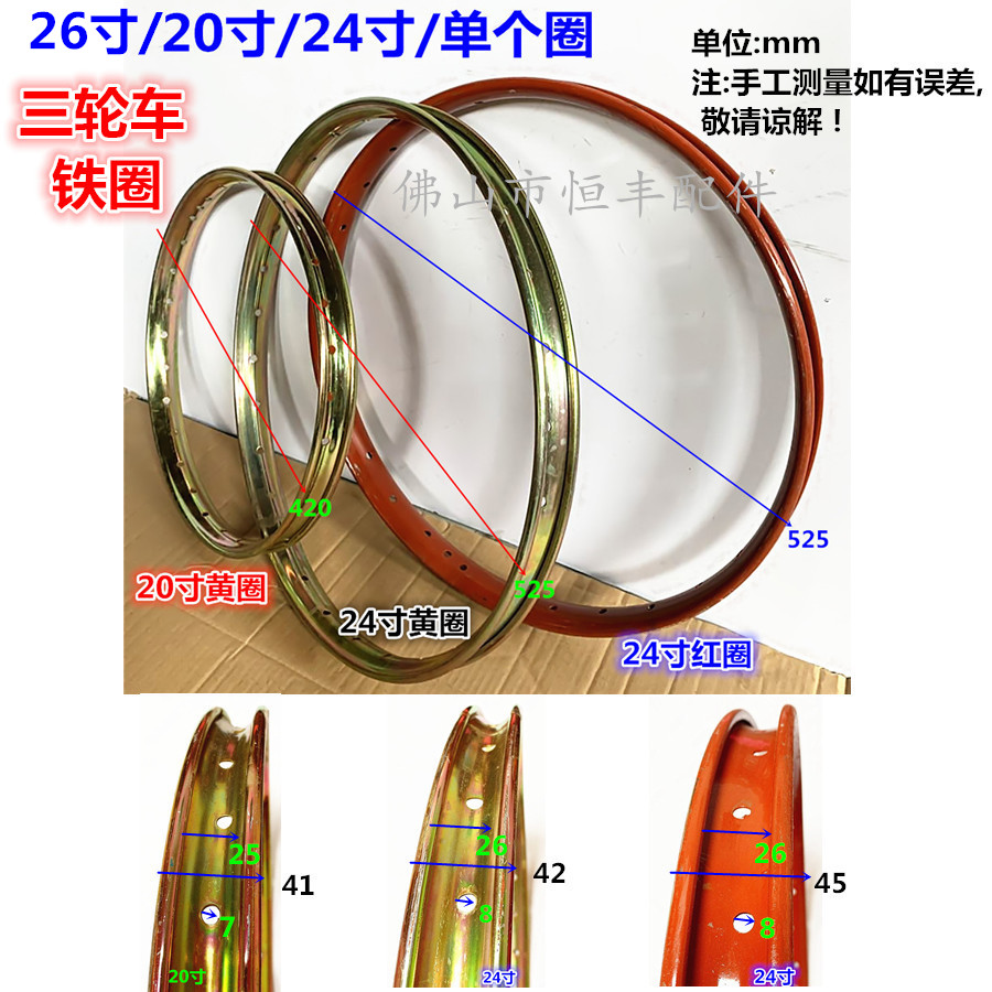 20 inch tricycle rim 28 holes (yellow circle) 24 inch tricycle rim 28 holes (yellow circle) 24 inch tricycle rim 28 holes (thick red circle) 26X11 2 front ring 40 holes (thick red circle)