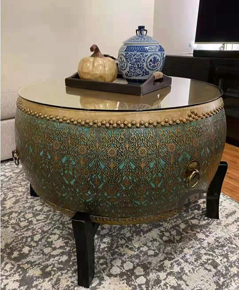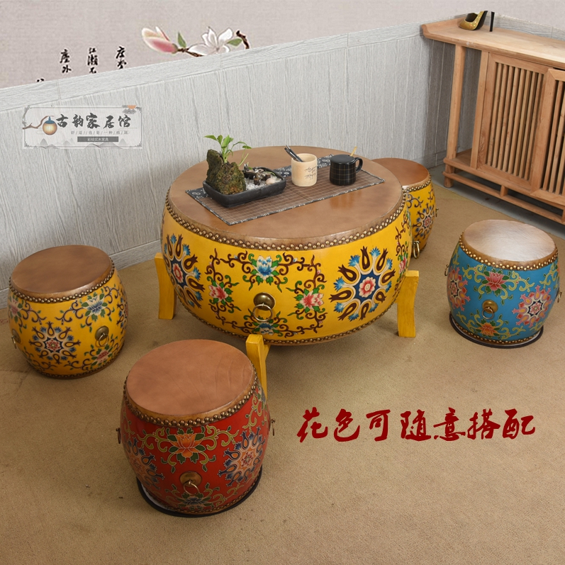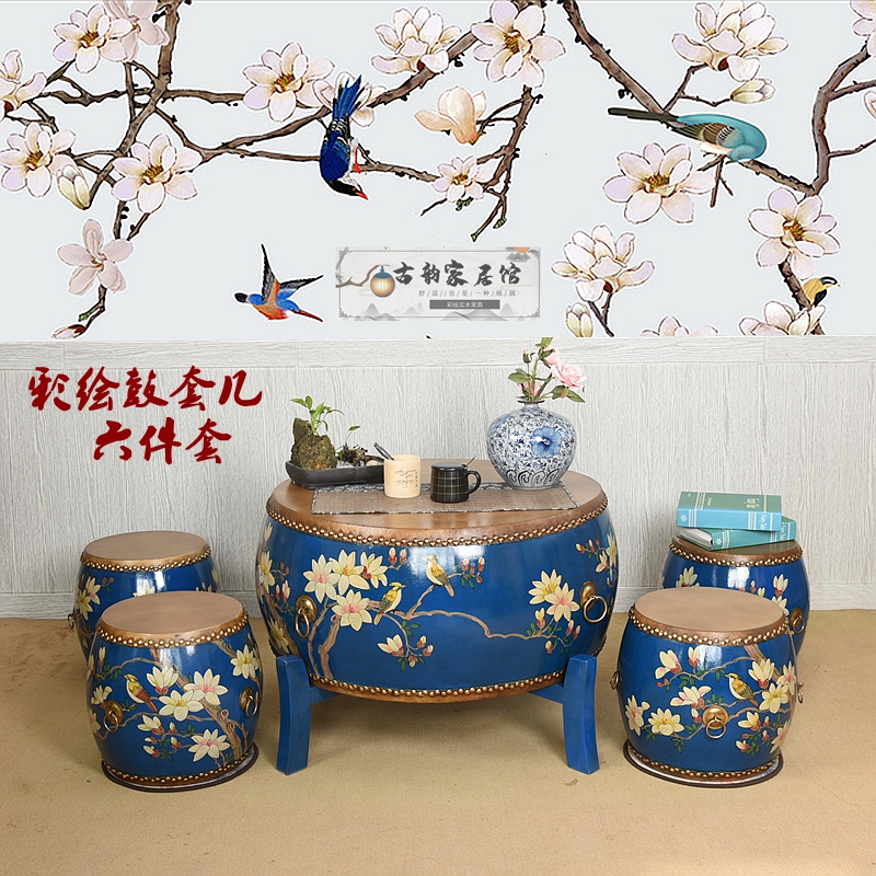 Painted Chinese tea table drum table drum stool combination of five pieces to make old beef leather set drum utility-style tea table guest hall round tea table