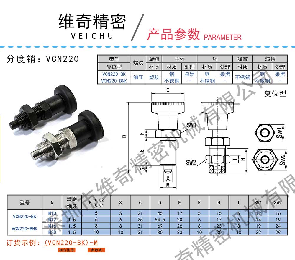 Knob plunger VCN220 series M20 M16 M12 M10 reset type spring pin positioning plunger
