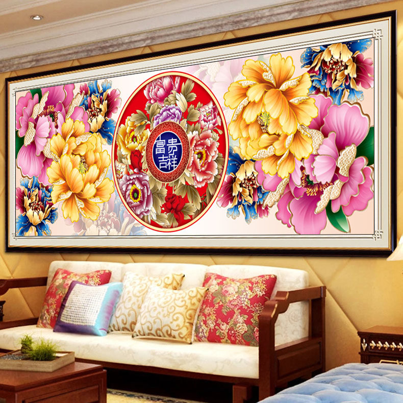 Flowers open rich and expensive cross embroidered 2023 new line embroidered living room sharply yourself embroidered with peony flowers auspicious picture-Taobao