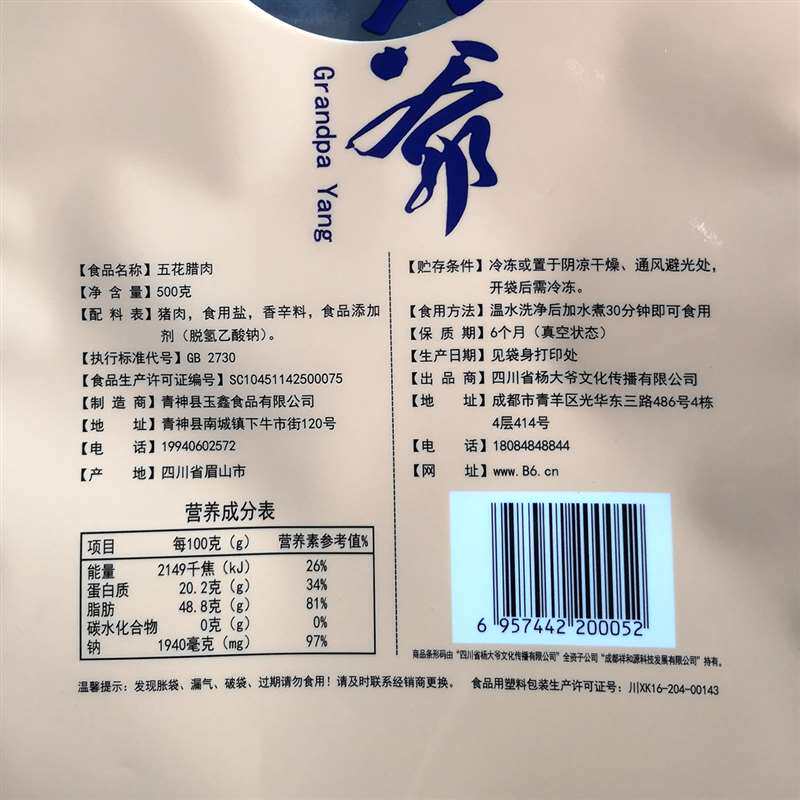 Uncle Yang Five-Flower bacon 500gX2 Sichuan specialty bacon homemade firewood smoked meat Bacon Bacon Pork pork