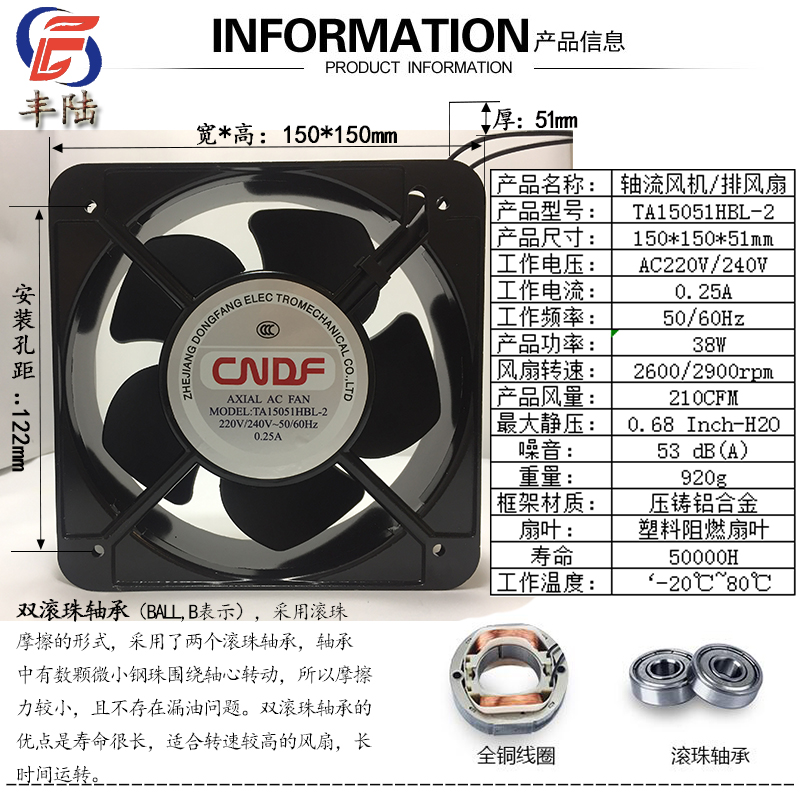 Exhaust fan square Eastern CNDF TA15051HBL-2 Ball bearing 220V axial flow fan heat dissipation fan