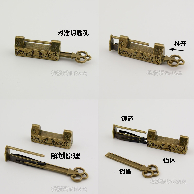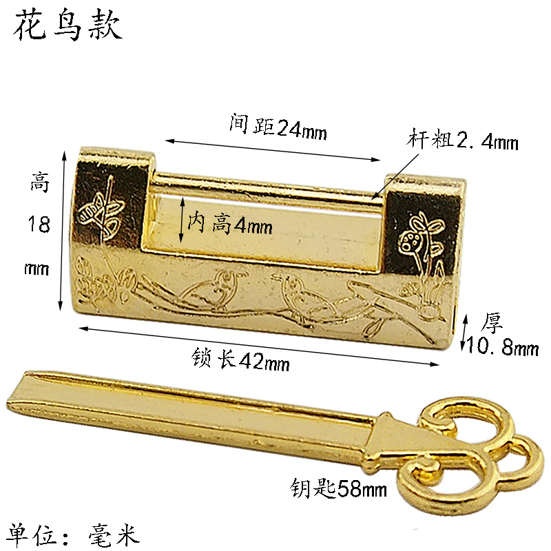 Flowers bird models antique lock small key lock Chinese made old case padlock cross open retro bronze color lock old ancient lock