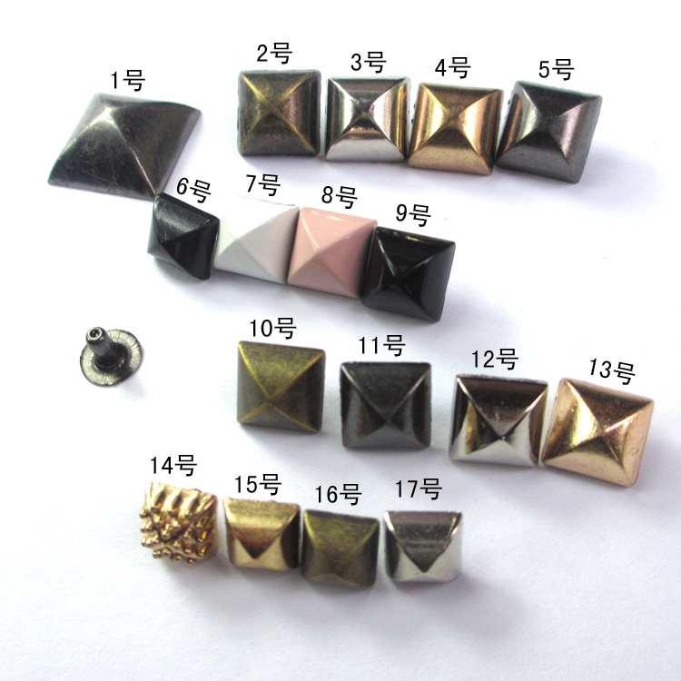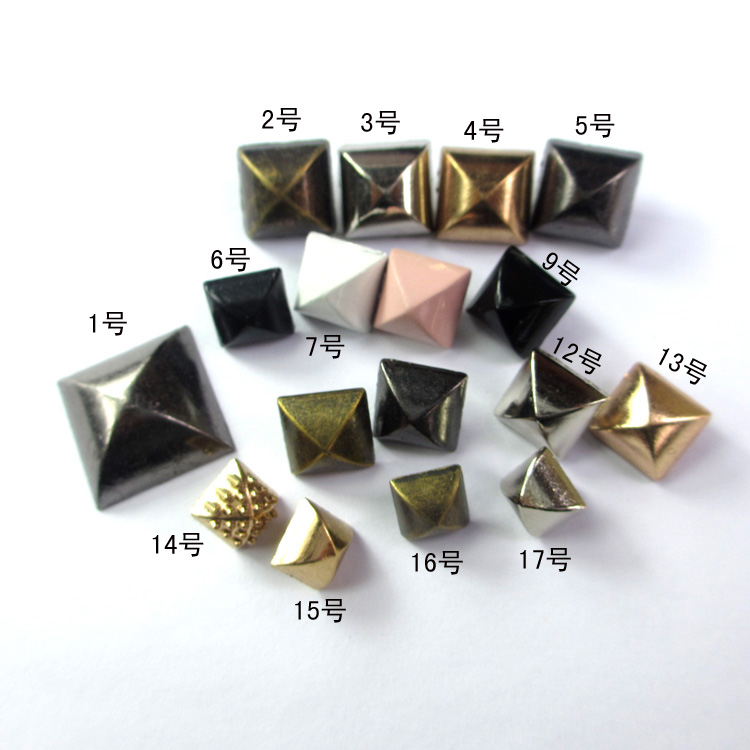 (No. 1) 10mm White Pyramid Nail (No. 2) Silver 8mm Pyramid Nail (No. 3) 8mm Gun Color Pyramid Nail (No. 4) Light Gold 8mm Pyramid Nail (5