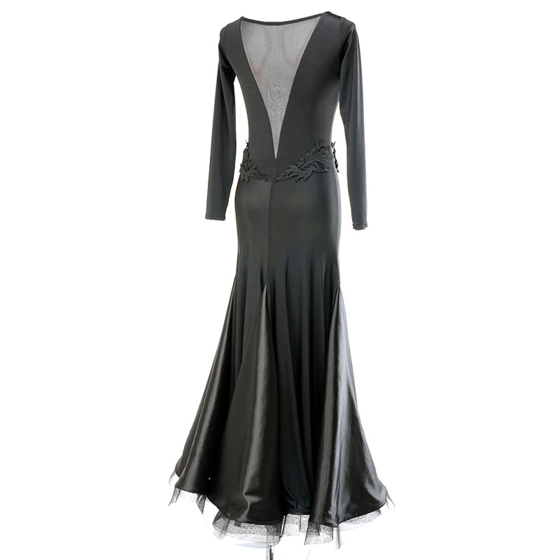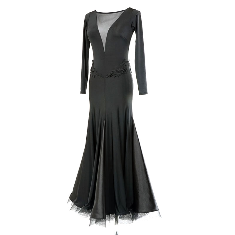 Exotical dance boat neck triangle transparent waist applique wide edge fishbone swing long sleeve modern dress W15056