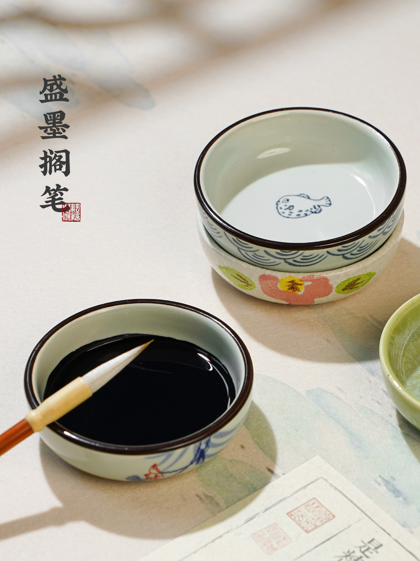 Ink Disc Ink Butterfly Ceramic Small Inkstone Water Disc Pack Ink Disc Calligraphy Ink Disc Sea Fish Round Disc Pen Licking Four Treasures of Study