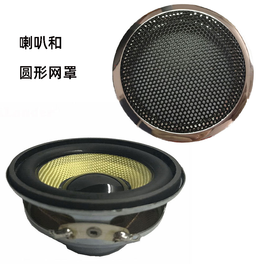 A yellow horn with a yellow trumpet with round mesh cover a yellow trumpet with mounting hole cover