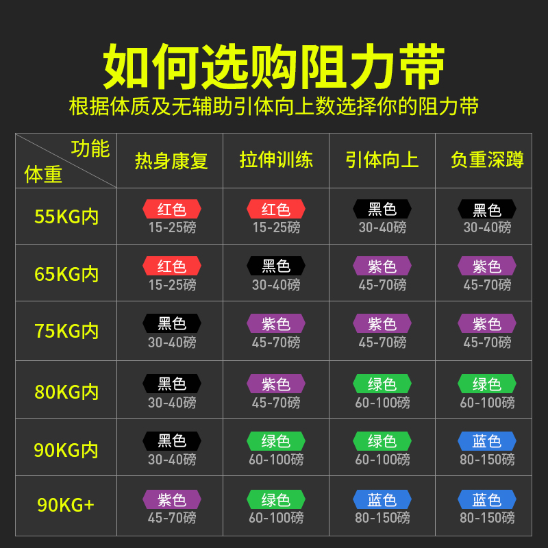 1.3*208CM Red Approx. 15-25 lbs. 2.1*208 Black Approx. 30-40 lbs. 3.2*208 Purple Approx. 45-70 lbs. 4.5*208 Green Approx. 60-110 LBs 6.4*208 Blue 80-150 LBs (Introductory Workout Combination)Purple 45-70 lbs+ Red 15-25 lbs (Advanced Workout Combination)Assist with Purple 45-70 lbs + Black 30-40 lbs (Professional Workout Combination) Assist with Purple 45-70 lbs + Green 60-110 lbs ( Hips - Slim Leg Combination) Auxiliary Band Purple + Hip Ring Purple 135 lbs (76cm) (Slimming - Abdominal Combination) Assist With Black + Dual Suction Cup Sit-Ups (Entry Advanced Recommended) Assist With Purple 45-70 lbs + Red 15-25 lbs + Black 30-40 lbs (Advanced Professional Recommendation) Assist with Purple 45-70 lbs + Black 30-40 lbs + Green 60-110 lbs Upgraded Suit Tension Rope (Men 115 lbs)) Upgrade Set Tension Rope (165 lbs. Reinforced)